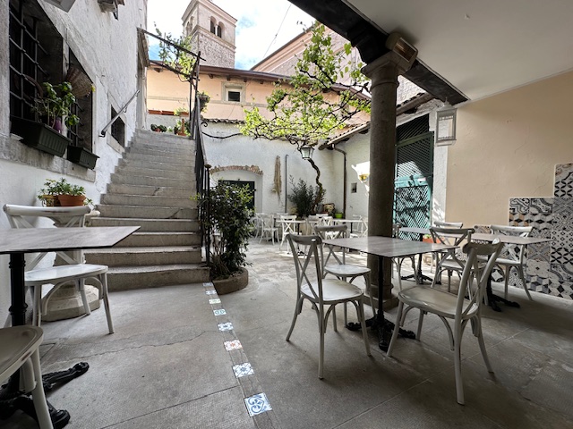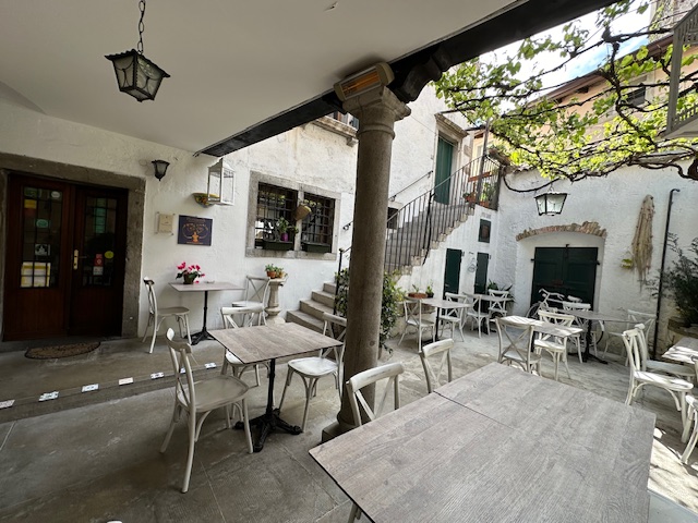 Il locale, molto accogliente, si distribuisce oltre che all’ingresso zona banco, anche in due sale interne distinte e un cortile esterno.