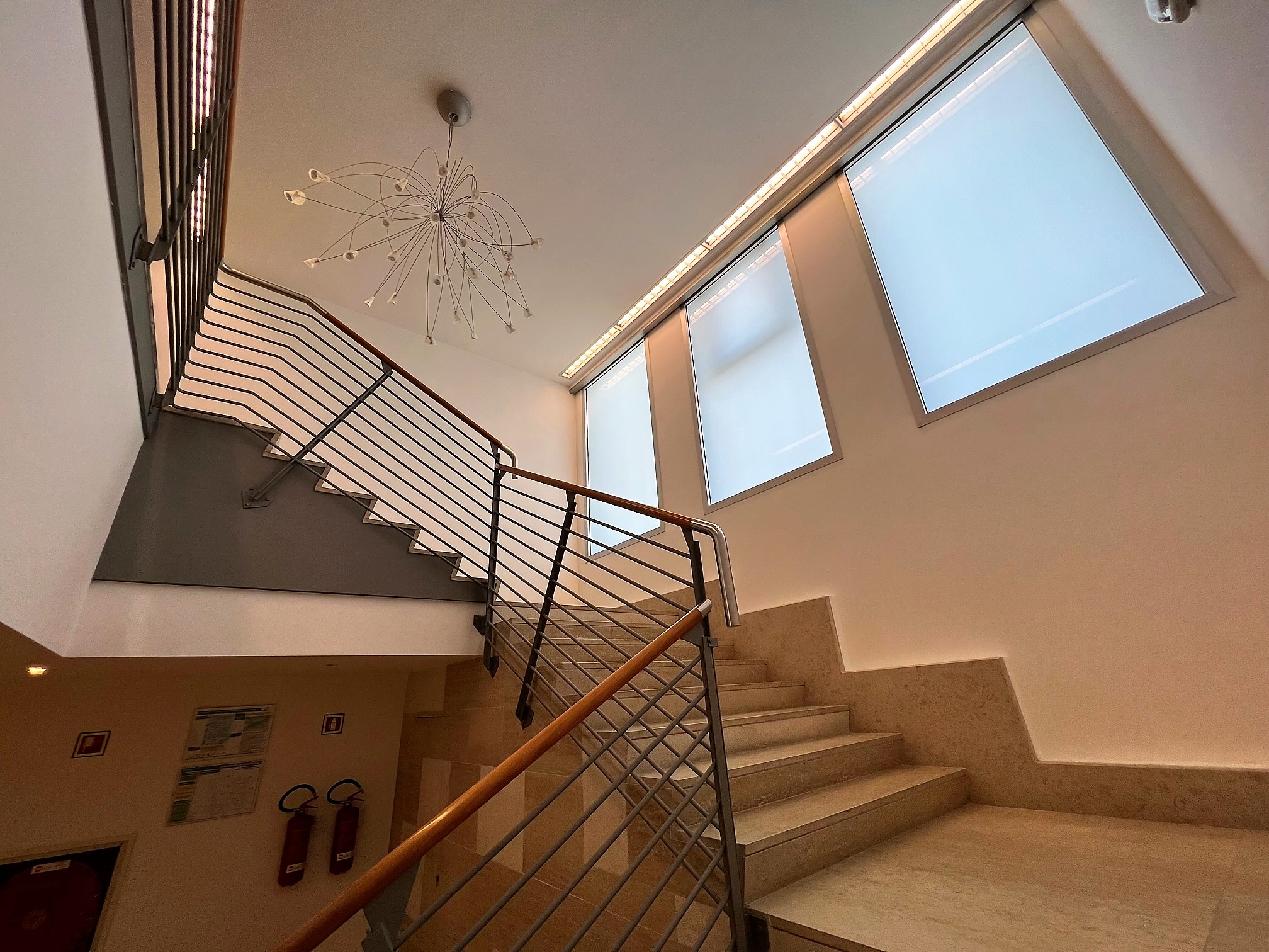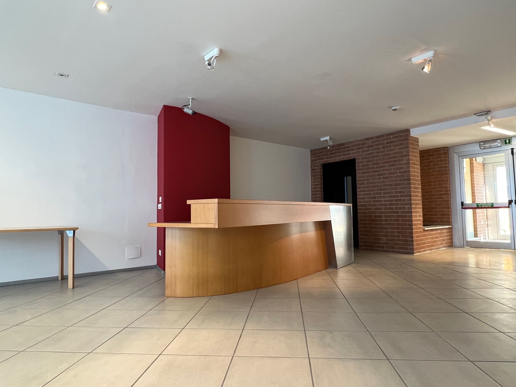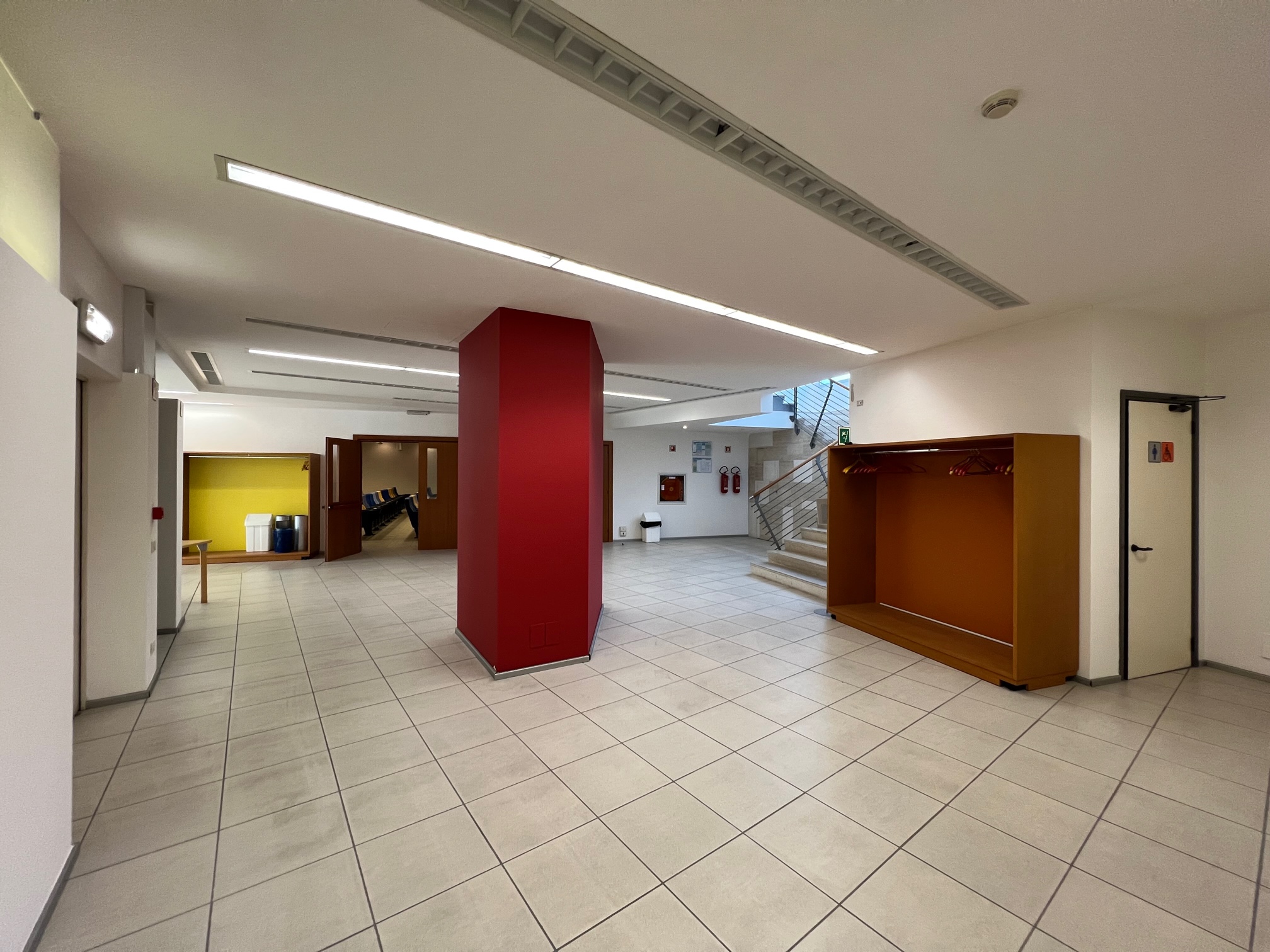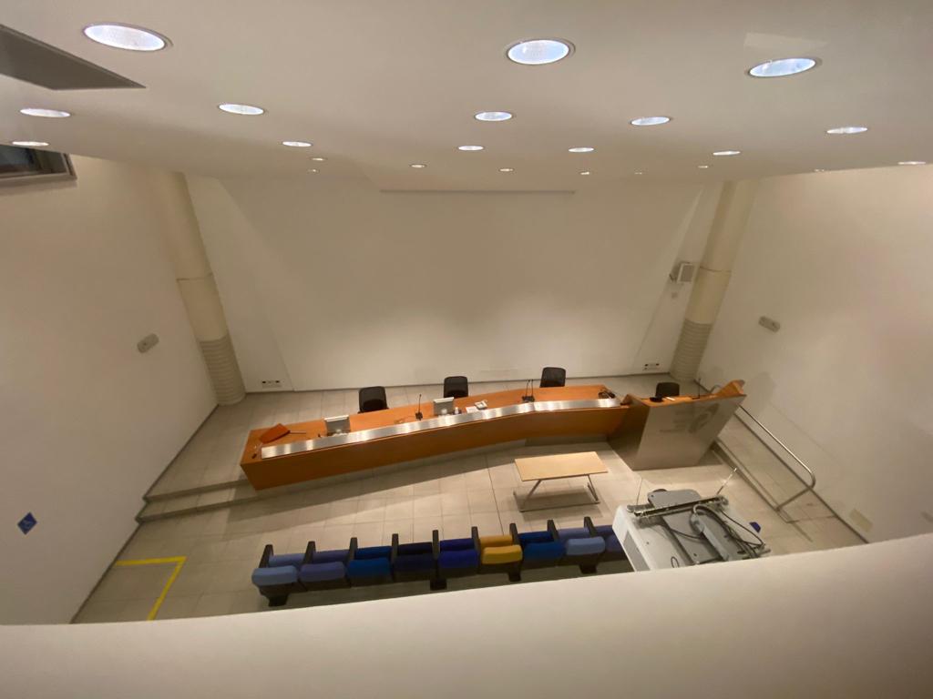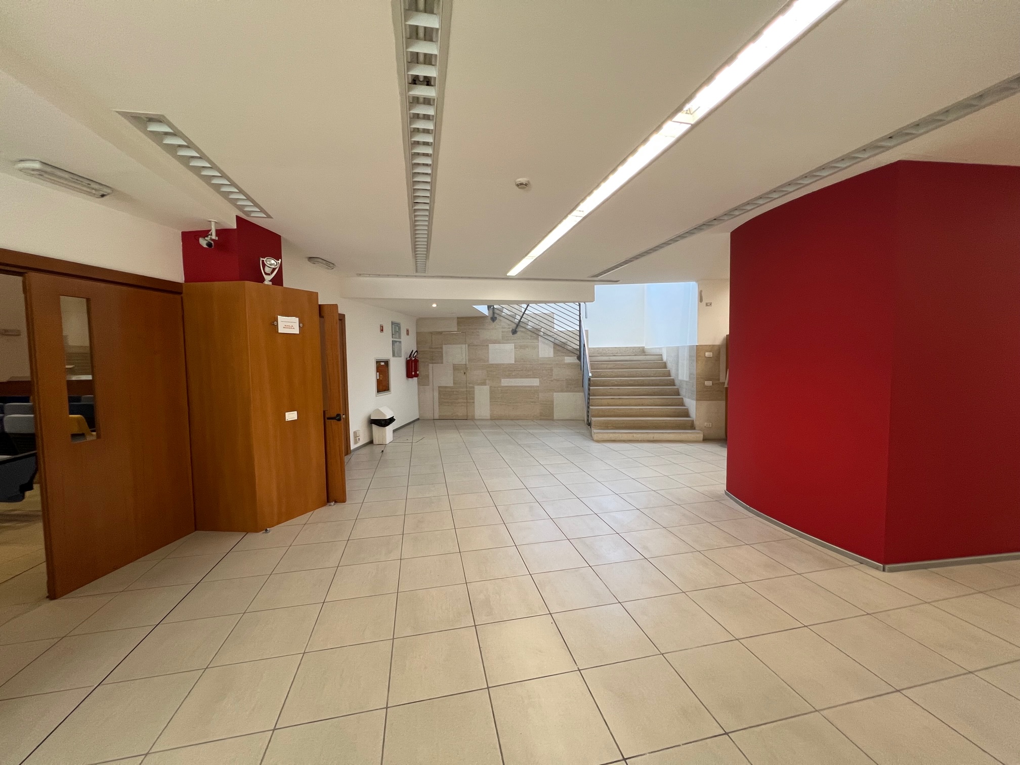 Ingresso con reception e atrio di rappresentanza, tre uffici, bagno e sala tecnica. Al piano sottostante raggiungibile anche tramite ascensore privato, abbiamo la sala convegni, i servizi, tre ampi atrii e due ulteriori sale riunioni.